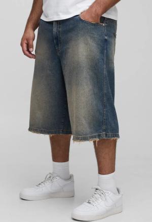 Plus Relaxed Longline Tinted Nibbled Pocket Denim Jorts - Antique Wash - 40, Antique Wash