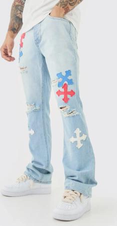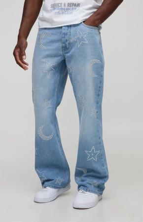 Relaxed Flared Blue Washed Star Studded Jeans - Ice Blue - 32R, Ice Blue