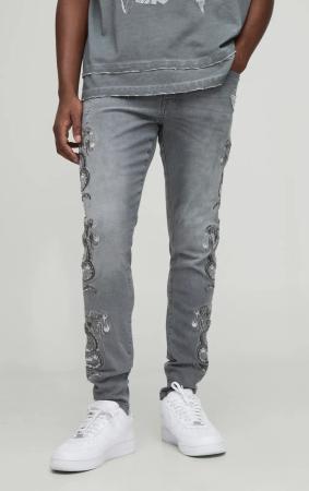 Skinny Fit Snake Embroidery Chain Jeans - Mid Grey - 32R, Mid Grey