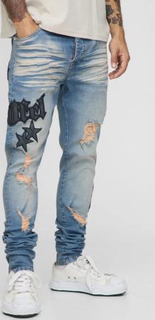Skinny Fit Stacked Pu Applique Washed Chain Jeans - Bleach Wash - 32R, Bleach Wash