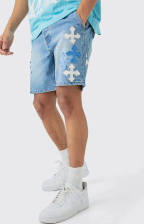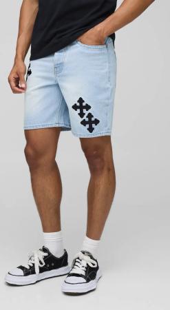 Slim Fit Washed Cross Embroidered Denim Shorts - Ice Blue - 32, Ice Blue