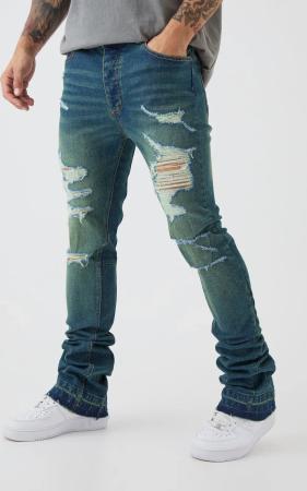 Skinny Stretch Flared Washed Ripped Gusset Jeans - Vintage Blue - 32R, Vintage Blue
