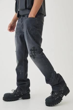 Slim-Fit Schlagjeans mit Acid-Waschung und Kreuz-Applikation - Grau - 30R, Grau