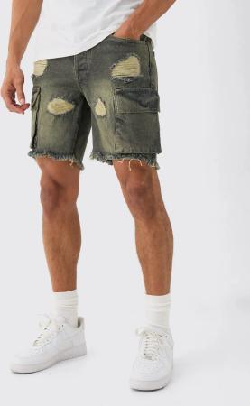 Zerrissene Slim-Fit Jeansshorts mit Cargo-Taschen - Grau - 30, Grau