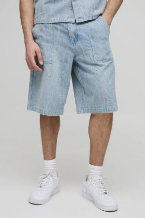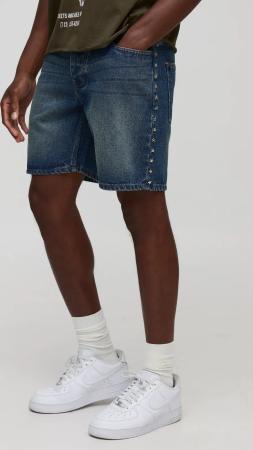 Slim Fit Antique Blue Star Studded Denim Shorts - 32R, Antique Blue