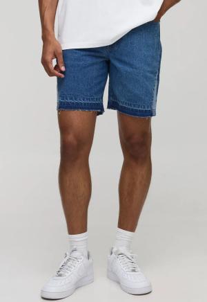 Straight Fit Washed Gusset Denim Shorts With Let Down Hem - Mid Blue - 32, Mid Blue