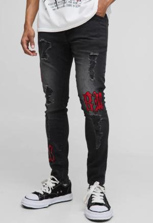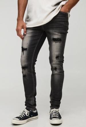 Skinny Fit Pu Applique Washed Ripped Jeans - Charcoal - 32R, Charcoal