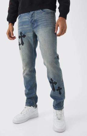 Slim-Fit Jeans mit Kreuz-Stickerei - Blau - 34R, Blau