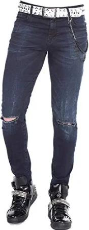 Herren Jeans Hose Destroyed Regular-Fit Slim Fit Denim Hose mit Schlüsselkette W32 L34 Dunkelblau