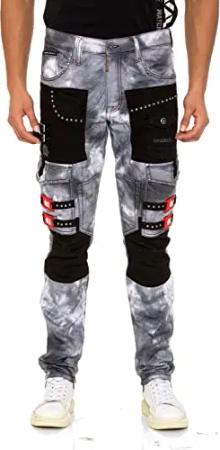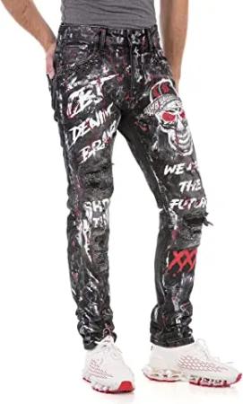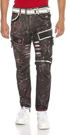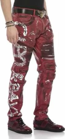Herren Jeans Hose Rippenmuster Biker Style Slim Fit CD636 Rot Farbklecks Denim Pants W42 L32