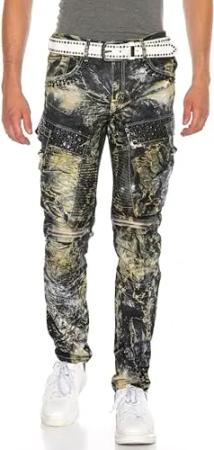 Herren CD494 Khaki Biker Jeans Ripped-Destroyed-Frayed-Slim Fit Jeans Hose mit Nieten und Muster