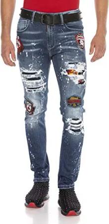 Herren CD494 Blau Biker Jeans Ripped-Destroyed-Frayed-Slim Fit Jeans Hose mit Nieten und Muster