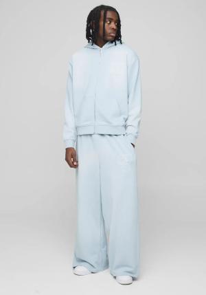 Oversized Boxy Varsity Zip Through Hooded Wide Leg Tracksuit - Blue - L, Blue