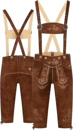 Herren Lederhose Tracht Kurz mit Hosenträgern Rindleder Trachtenhose Premium Tracht Oktoberfest Volksfest Kurz geschnitten mit stilvollen Riemen (Braun, 48)