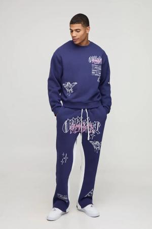 Kastiges Oversize Sweatshirt mit Graffiti-Print & Jogginghose - Blau - M, Blau