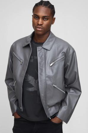 Boxy Fit Zip Detail Pu Collared Bomber Jacket - Charcoal - M, Charcoal