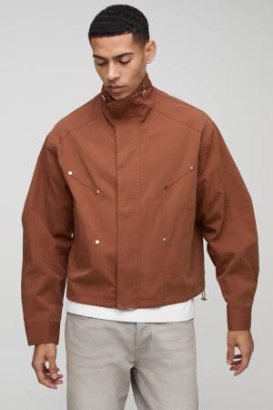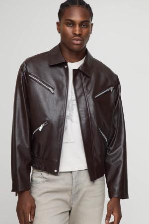Boxy Fit Zip Detail Pu Collared Bomber Jacket - Chocolate - S, Chocolate