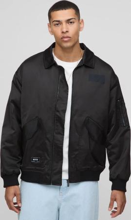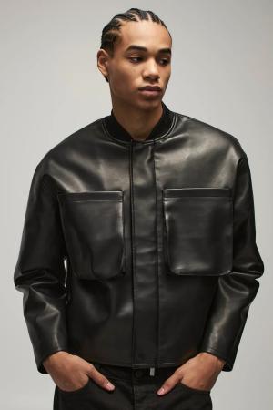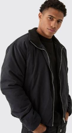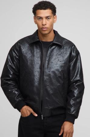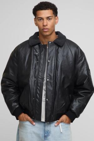 Man Oversized Washed Pu Borg Collared Bomber Jacket - Black - S, Black