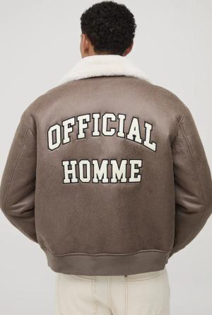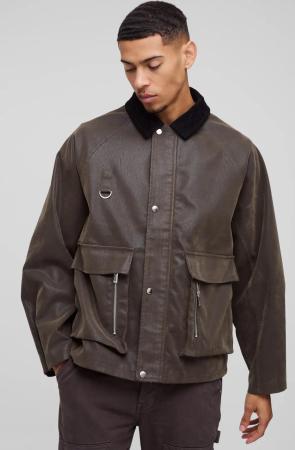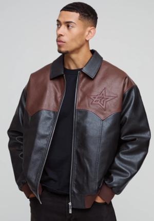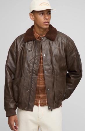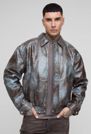 Man Oversized Washed Pu Borg Collared Bomber Jacket - Brown - S, Brown