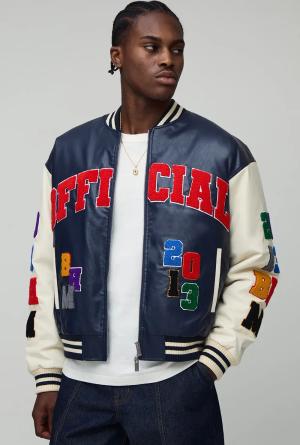 Oversized Boxy Fit Letter Badge Official Applique Pu Varsity Bomber Jacket - Navy - L, Navy