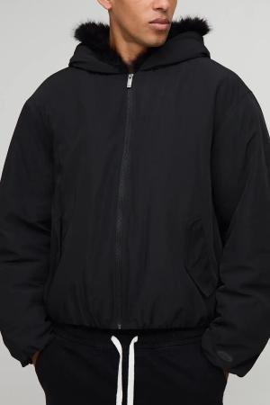 Oversized Faux Fur Trim Hooded Bomber Jacket - Black - L, Black
