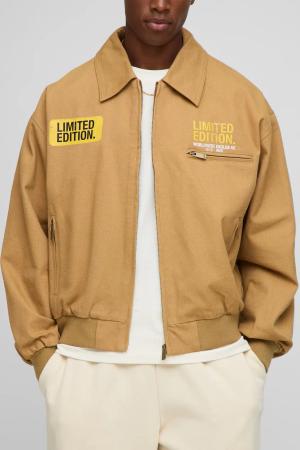 Oversized Fit Twill Printed Fold Collar Bomber Jacket - Brown - L, Brown