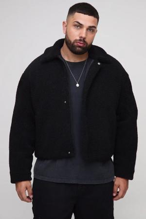 Oversized Boxy Textured Pu Borg Collar Bomber Jacket - Black - L, Black