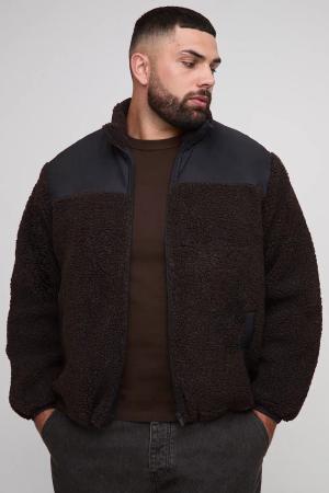 Plus Regular Fit Borg Zip Through Nylon Panel Funnel Neck Jacket - Chocolate - 2Xl, Chocolate