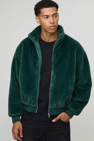 Regular Fit Faux Fur Funnel Neck Bomber Jacket - Forest - L, Forest