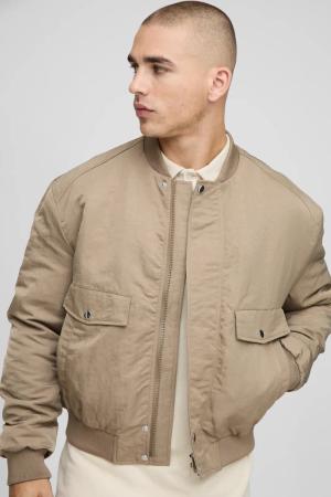 Regular Fit Peached Crinkle Nylon Bomber Jacket - Stone - L, Stone