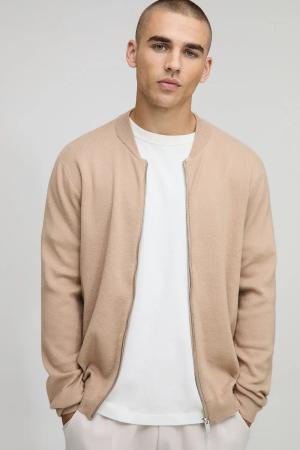 Regular Fit Smart Knitted Bomber Jacket - Taupe - S, Taupe