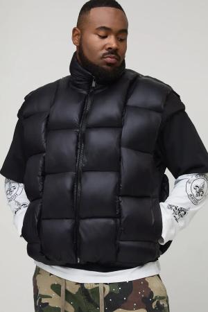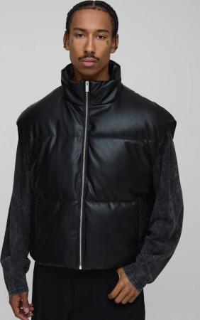 Boxy Fit Curved Hem Pu Puffer Gilet - Black - L, Black