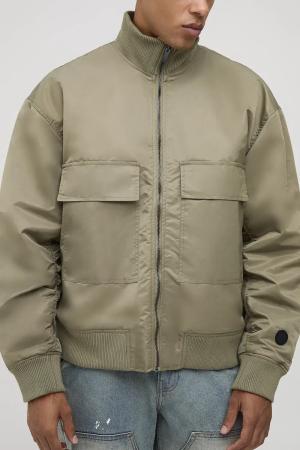 Oversized Fit Chunky Rib Funnel Neck Bomber Jacket - Khaki - M, Khaki