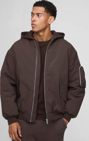 Oversized Fit Pu Applique Nylon Hooded Bomber Jacket - Chocolate - S, Chocolate