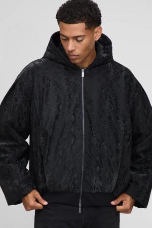 Oversized Pu Snake Printed Hooded Bomber Jacket - Black - L, Black