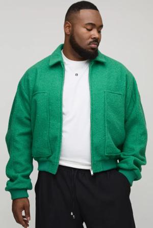 Plus Boxy Boucle Ruched Sleeve Bomber Jacket In Green - 3Xl, Green