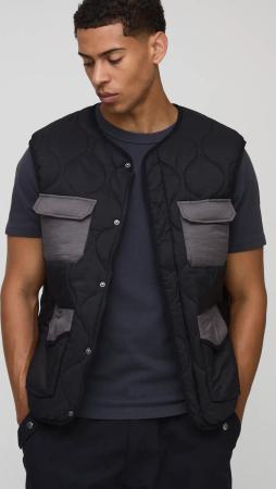 Regular Fit Collarless Quilted Ripstop Colour Block Gilet - Black - M, Black