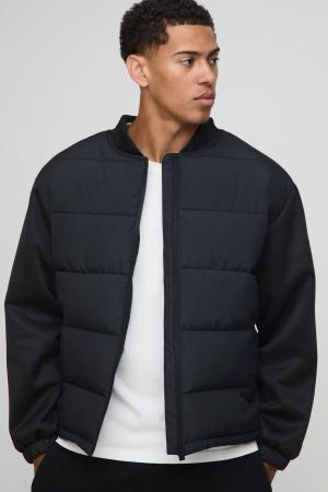 Tall Regular Fit Padded Nylon Panelled Bomber Jacket In Black - L, Black