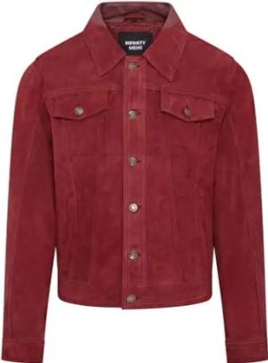 Herren-Jeansjacke aus weinrotem Ziegenwildleder im Trucker-Stil aus Westernleder