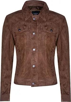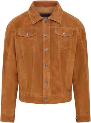 Herren Tobacco Ziege Wildleder Jeansjacke Trucker Casual Denim Leder Braunes Hemd