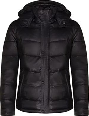 Herren-Pufferjacke Schwarz Abreiben Steppjacke aus Leder mit Kapuze S