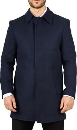 Herren Wollmischung Marineblau Mantel Klassischer Kragen Winterjacke Trenchcoat