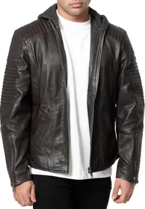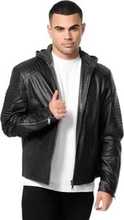Lederjacke Herren Leder Jacke Biker-Look Echtleder mit abnehmbarer Kapuze A800 (Schwarz, XL)