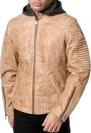 Lederjacke Herren Leder Jacke Biker-Look Echtleder mit abnehmbarer Kapuze A800 (Camel, XL)