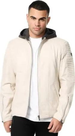 Lederjacke Herren Leder Jacke Biker-Look Echtleder mit abnehmbarer Kapuze A800 (Weiß, XXL)