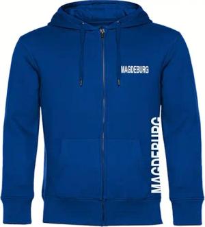 Kapuzen Sweatshirt Jacke - Magdeburg - Brust & Seite - Druck weiß - Sweat Größe M blau