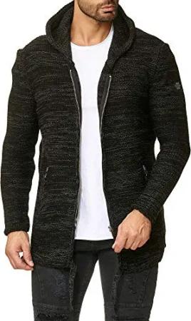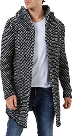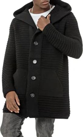 Herren Strickjacke Stickpullover Cardigan mit Kapuze Rough Schwarz XL