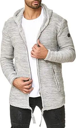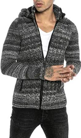 Herren Strickjacke Stickpullover Cardigan mit Kapuze Rough Grau S