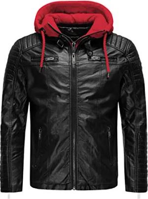 Robuste Lederjacke Kunstleder Bikerjacke mit abnehmbarer Kapuze Schwarz-Rot S