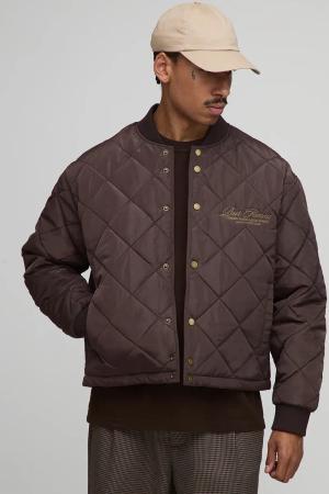 Boxy Fit Embroidered Diamond Quilted Nylon Bomber Jacket - Chocolate - L, Chocolate